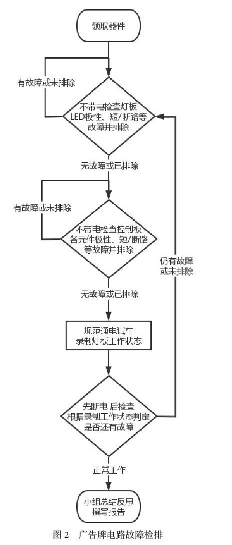 “广告牌”电路排故项目,综合了模数电子知识和锡焊、排故等基本技能。为锻炼综合分析能力,本项目以往届生已焊接的故障电路板为实训素材。实施中,以3-5人为小组,对项目分解为三个主要实施环节。