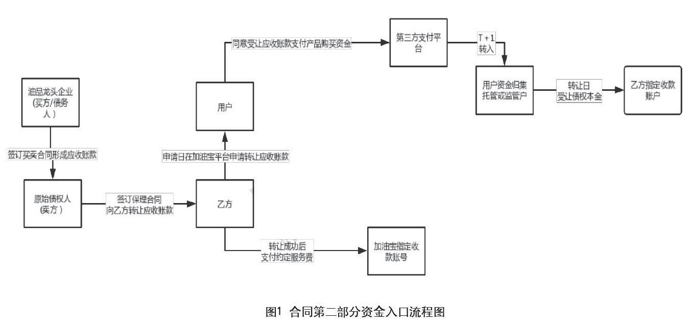 此产品的合同前后矛盾,涉嫌欺骗客户。合同中“加油宝产品服务协议”指出:乙方(保理公司)与债务人签订了保理合同,受让了债务人与国内众多优质的油品龙头企业的应收账款,乙方在加油宝平台(丙方)推出“应收账款转让”计划,为本合同的债权转让方,为甲方(加油宝用户)的资金提供资金增值和安全保障等。该“新手专享”产品由乙方通过丙方将“油品龙头企业”转让给乙方的债权关系再次转让给甲方。由乙方向原始债务人进行账款催收。而在合同第二部分,资金入口流程图中混淆了债务人与债权人究竟为哪一方,与服务协议内容不一致,导致甲方无法明确知晓资金的去向和用途,如果丙方平台跑路,甲方难以维权。