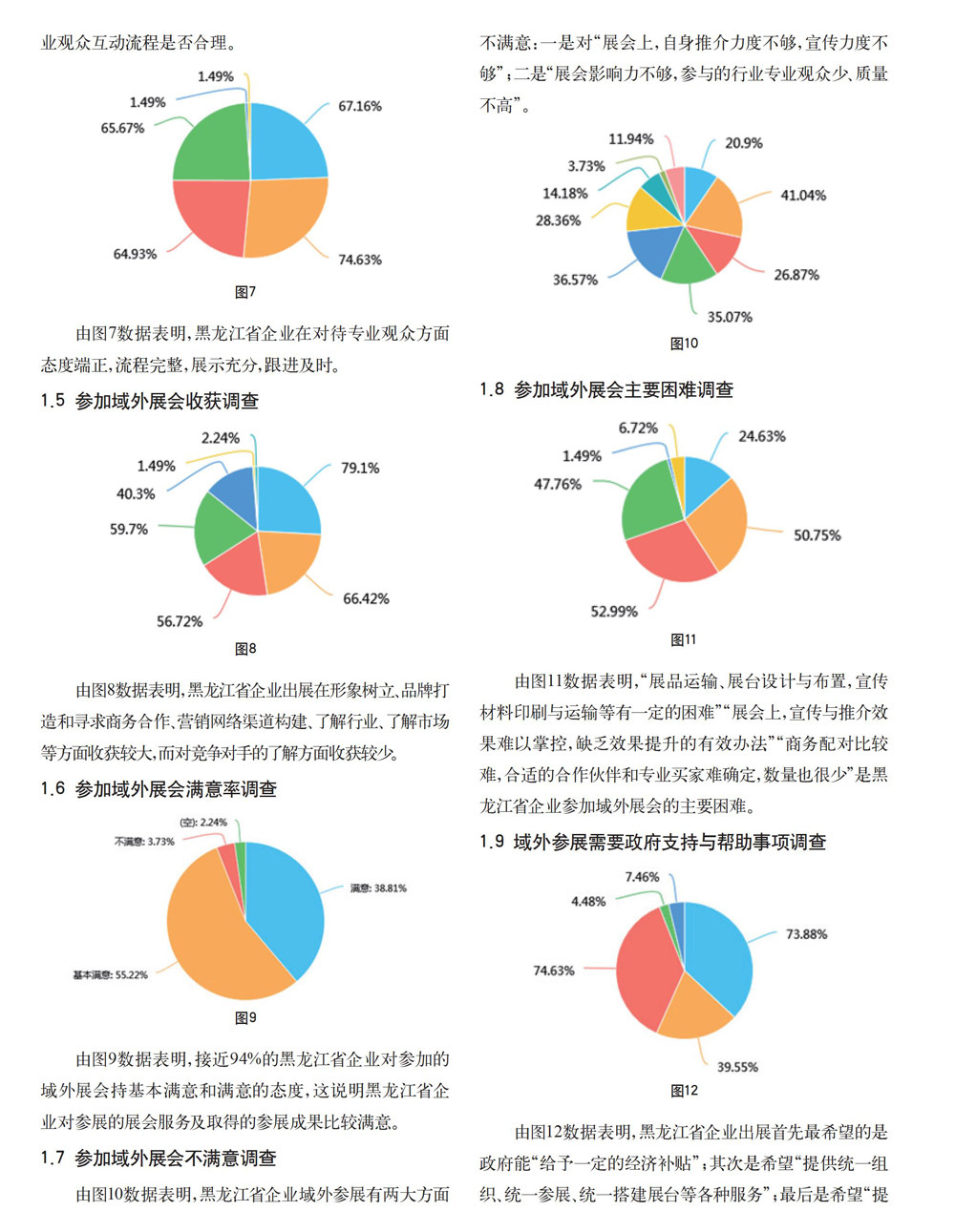 由图9数据表明,接近94%的黑龙江省企业对参加的域外展会持基本满意和满意的态度,这说明黑龙江省企业对参展的展会服务及取得的参展成果比较满意。