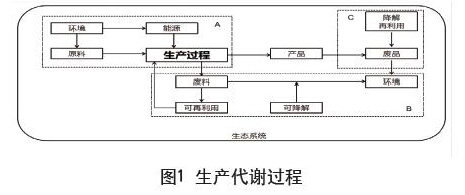 生产代谢过程,是类似于生态系统中能量物质交换、转化时发生的代谢循环过程。在生产过程中表现为资源的利用和再利用及生产过程的循环衔接(见图1)。生产需要从环境中攫取原料和能源,相当于一种物质能量的输入;具体的生产过程是将原料和能源转化为相应的产品,同时排出废料,相当于物质能量转化为具体形态的过程;产品经过使用变成废品,其中的物质能量在使用中为人们所利用,体现其价值,废品回到环境中,相当于一个输出的过程。产业共生网络的生产代谢过程与传统意义上的生产过程不同之处在于图中的A、B、C三个部分,必须做到对环境负担最小。A部分要提高资源利用率来减少对生态环境的损耗,B部分和C部分需要通过一定的技术,将输出过程的废弃物质和能量,要么转化为可以被环境承受的形态,无害地融入环境中,要么形成下一个生产过程可以利用的形态,重新进入生产过程,参与接下来的物质能量交换。