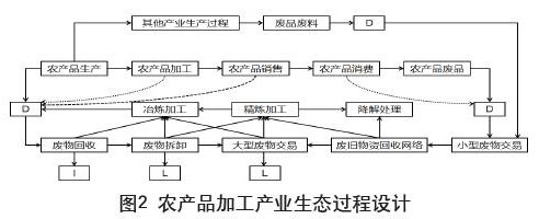 从图2可以看出,农产品生产过程中,每个环节都有可能产生危害生态环境的产物,图中D表示废物。所有的废物都需要进行回收和处理,从生产和消费的环节来看,废物的回收是一个从分散到集聚的过程,需要中间商参与收集和分类交易,形成废物回收网络,并有序处理。再由大型废物交易厂商,分销到再加工的冶炼和精炼部门进行加工,获取再利用的可能性,或者进行降解,减少对环境的危害和资源浪费。经过一系列环节,不可再利用的最终废弃物就进行焚烧(图中的I表示)和填埋处理(图中的L表示)。