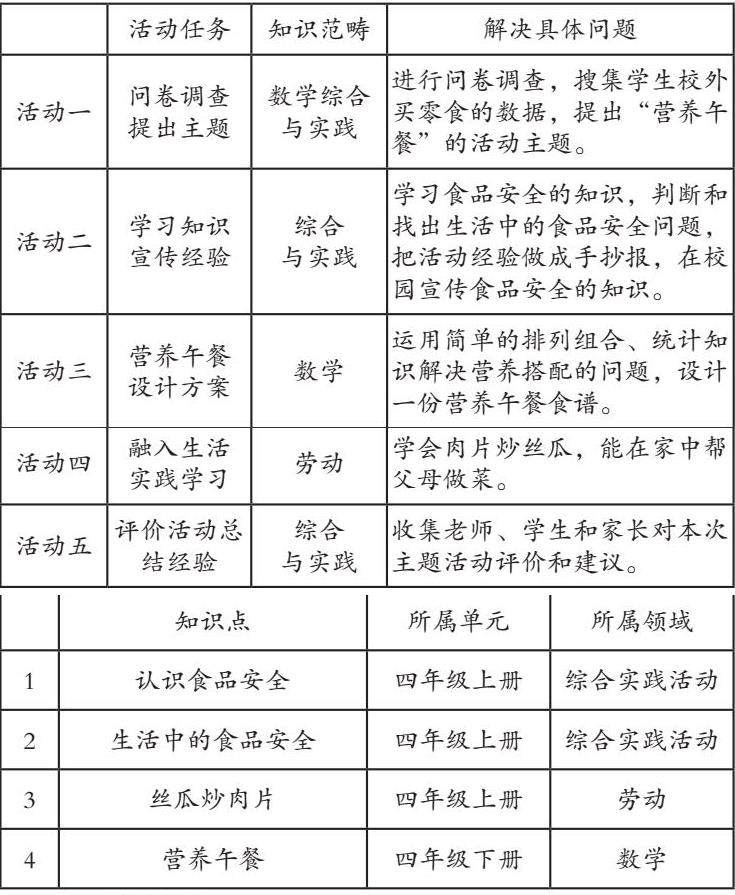 在综合与实践活动中,学生运用了数学、语文、综合与实践、劳动实践等学科知识与生活经验来解决“营养午餐”的问题,以小组合作的形式来展开研究,学习食品安全知识、设计营养午餐和学会肉片炒丝瓜等。其中,涉及以下知识点。