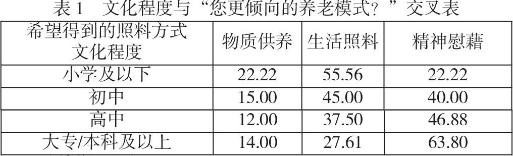 从表1的数据可以看出,生活照料和精神慰藉逐渐成为了养老的主要内容。值得关注的是选择精神慰藉的占比是随着学历的提高而提高的,这证明文化程度高的人往往会更注重于精神生活。而且,随着人们生活水平的普遍提高,物质供养需求反而减少了。