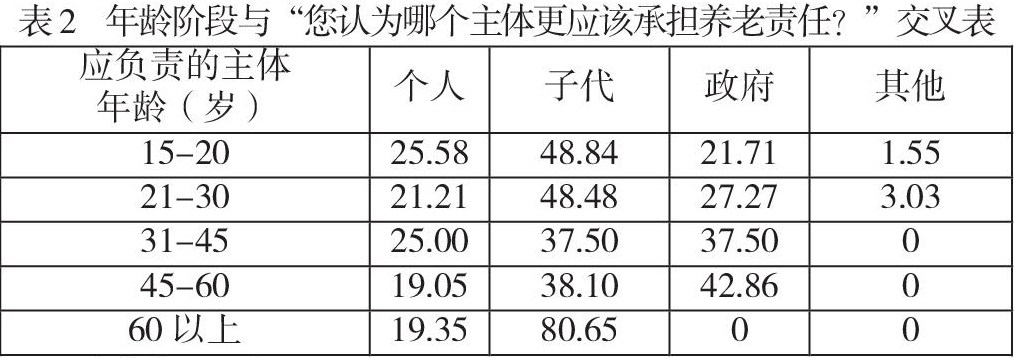 表2养老主体是养老责任的主要承担者。在我国“传宗接代”、“养儿防老”观念的影响下,儿子长期被认为是养老责任的唯一主体。在我们的调查数据可以看出,各年龄层选择子代的比例普遍偏高,这说明传统的观念并没有因现代化而改变,中国人的认知受传统观念的影响较深。此外,我国养老责任承担主体也趋向多元化,个人和政府也是重要的养老责任主体。随着社会经济发展,社会福利普遍提高,政府在养老实践中发挥的作用越来越大。45-60岁年龄层的对政府的期待高达42.86%。