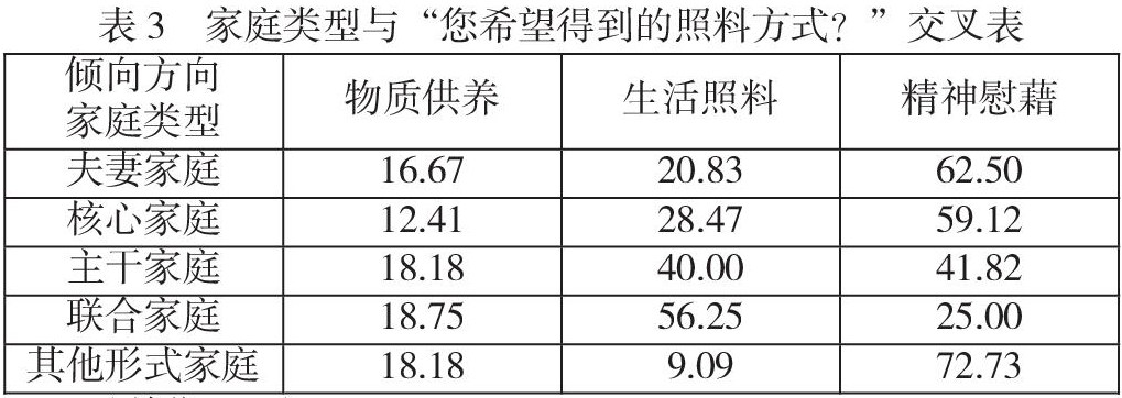 由表3可以看出,不同的家庭类型对于照料方式的选择有着较大的相似度。在各自的选择中,除了联合家庭,精神慰藉占据了最大的比例,这表明现代人随着生活水平的提高,越来越关注精神生活。其次,生活照料占据了次要的位置,表明养老生活质量的提高是离不开高质量生活照料的。