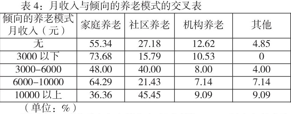 通过表8可以看出各个月收入水平(除10000以上)的人选择的大都是家庭养老,其占比都超过了50%,尤其是低收入人群(3000元以下),有73.68%的人选择相对便宜且常规的养老模式-----家庭养老。月收入为10000元以上的人群则会有更多的选择,例如他们会更倾向于选择社区养老方式。