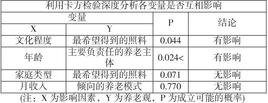 由上述数据我们能明确文化程度对最希望得到的照料、年龄对应负责任的主体是有影响的,下面我们就来分析这两个因素如何影响养老观: