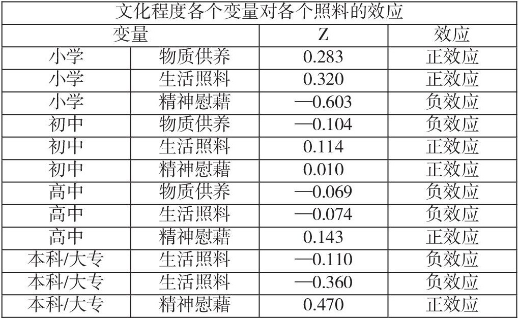 Z为两个变量的相关系数,从此可以看出Z(小学,物质供养)、Z(小学,生活照料)、Z(初中,生活照料)、Z(初中,精神慰藉)、Z(高中,精神慰藉)、Z(本科/大专,精神慰藉)都是正值,即表示两个变量是正效应,我们还能分析出,小学学历对物质供养和生活照料这两方面正效应在最高,在精神慰藉方面负效应最大,本科/大专对精神慰藉方面正效应最高,对生活照料负效应最大。