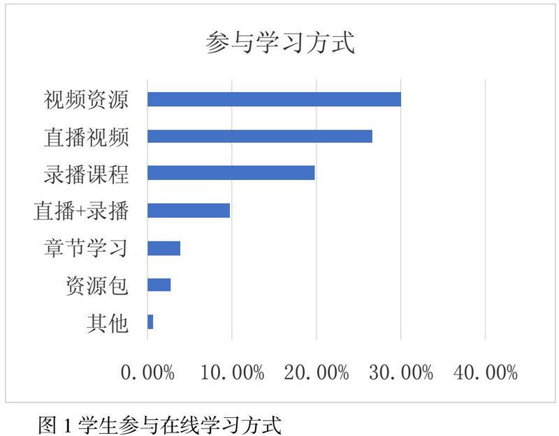 (2)参与学习方式。已有数据显示,学生目前采用线上学习方式占比最大的是观看视频资源(29.98%),次之是直播视频(26.5%),观看录课视频的学习占比为19.8%,观看直播+录播视频的学习占比为9.87%,章节学习占比为3.8%,资源包学习占比为2.67%,其他形式占比0.65%。如图1所示。