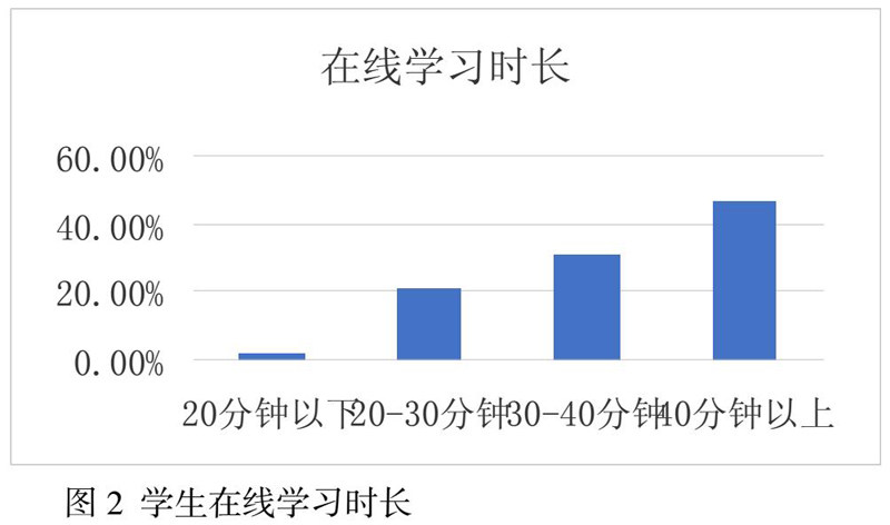 (3)在线学习时长。如图2所示,在线学习时长20分钟以下的占比为2.1%,20-30分钟占比为21%,30-40分钟占比为30.5%,40分钟以上占比为46.4%。