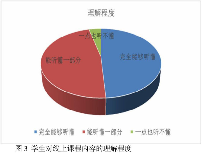 (4)对线上课程内容的理解。据数据显示,学生对线上课程内容的理解程度如图3所示,有48.9%的学生完全能够听懂,47.2%的学生能听懂一部分,只有3.9%的学生一点也听不懂。