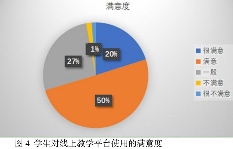 (5)对线上教学平台使用的满意度。根据数据统计显示,学生对线上教学平台使用的满意度如图4所示。其中20.1%的学生表示很满意,50.2%的学生表示满意,26.6%的学生表示一般,1.68%的学生表示不满意,1.2%的学生表示很不满意。