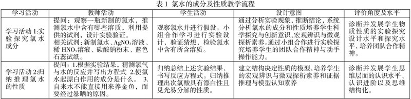 进行化学学科教学设计前,应明确化学学科的课程目标,即化学核心素养的培养。在进行教学设计时,教师应打破传统教学设计的桎梏,整体而全面的掌握课程目标,合理规划课程与教学内容,设计整体单元教学。在根据单元教学的目标,细化至课时目标。新版课程标准中对“氯及其化合物”的内容要求是“结合真实情境中的应用实例或通过实验探究,了解氯及其重要化合物的主要性质,认识这些物质在生产生活的应用和对生态环境的影响”。根据化学学科核心素养发展水平和学业质量水平分析,制定“氯及其化合物”的教学目标如下:(1)了解氯元素的存在,了解氯气是一种活泼的非金属单质,通过氯气与金属单质、非金属单质的转化,掌握其化学性质,认识并建立物质性质与其用途的关联。(2)通过实验探究氯水的成分及性质,了解氯水的漂白原理,培养学生的宏观辨识与微观探析和科学探究与创新意识的核心素养。(3)通过学习漂白粉、消毒液原理的以及了解含氯消毒剂的使用,培养学生的科学态度与社会责任素养。