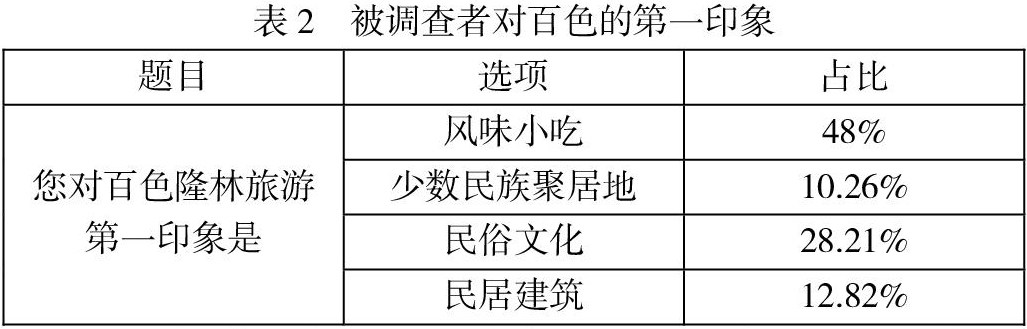 通过表2可以看到被调查者所认为的百色隆林第一印象地占比情况,可分析出被调查者对百色隆林的哪个方面旅游感兴趣。