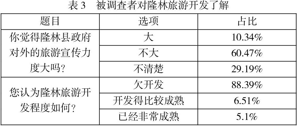 从表3可以看出,有60.47%的游客认为政府宣传力度不大,29.19%的游客不清楚。游客对于隆林旅游资源了解较少,甚至部分游客对于隆林的旅游宣传感到陌生,这一情况说明隆林的旅游知名度较低。对于隆林的旅游资源开发情况,有88.39%的游客认为欠开发,由数据可知,隆林旅游仍有较大的开发空间。政府还需给予政策支持,加强宣传投入力度,对百色隆林进行深度开发。