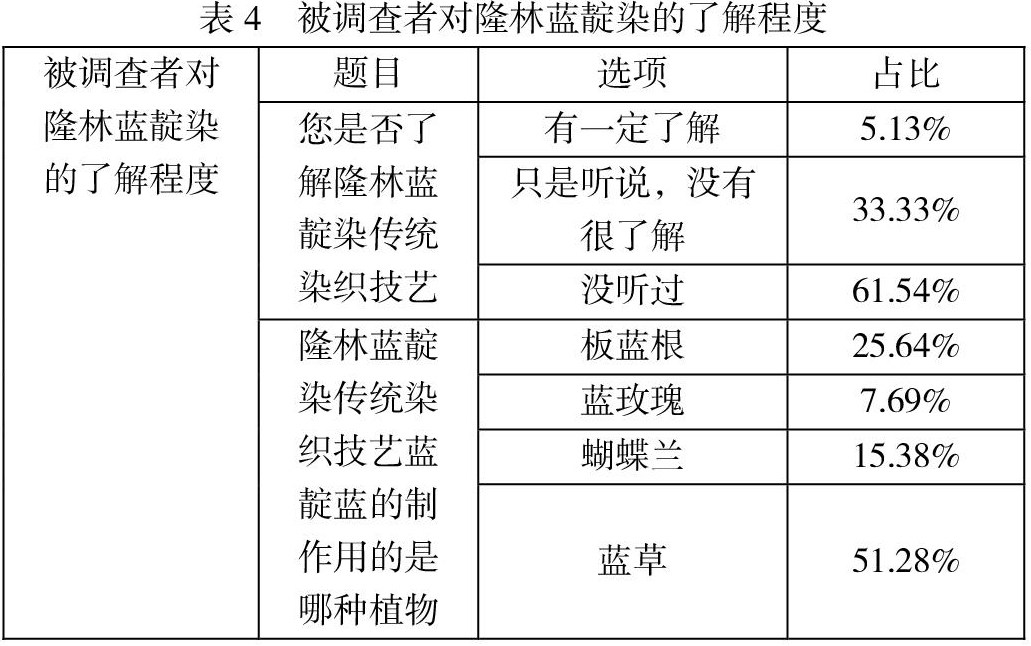 通过调查发现(如表4)仅有5.13%对隆林蓝靛染传统染织技艺有一定了解,从反馈的信息看,人们对于隆林蓝靛染传统染织技艺多停留在未了解的状态,只有少数人对蓝靛染有一些了解,但多是蓝靛染手工艺者或政府相关人员。表明百色隆林缺乏旅游营销策略,缺乏自我包装,游客对当地的传统技艺较为陌生。