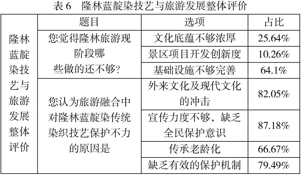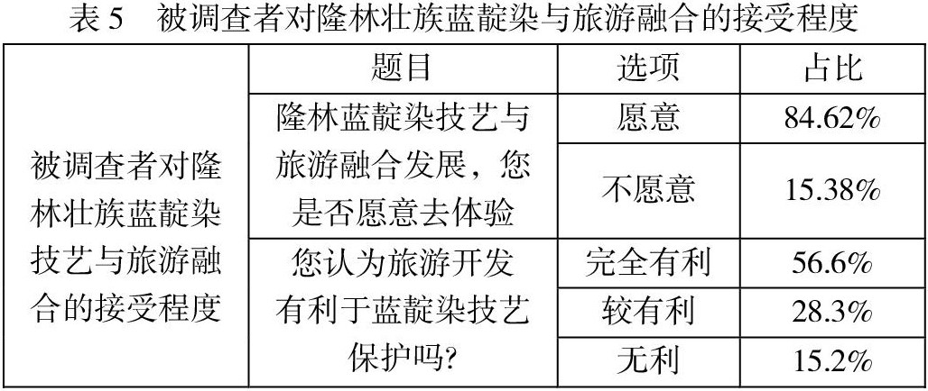 从表4、表5、表6可以分析出被调查者对隆林蓝靛染的了解程度、推荐意愿程度以及隆林蓝靛染技艺与旅游发展整体评价,通过被调查者选择的三个方面进行反馈的:被调查者对隆林蓝靛染的了解程度、被调查者对蓝靛染的接受程度及对隆林蓝靛染与旅游融合发展状况的看法。