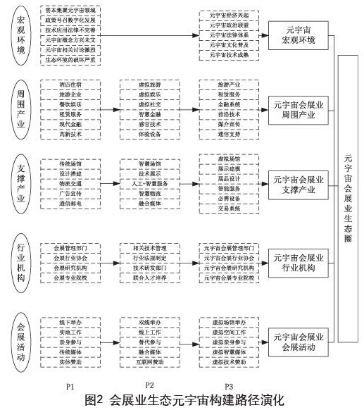 研究发现,元宇宙会展业的发展路径大致可分为三个阶段,P1阶段主要着眼于五大要素过去发展情况,P2阶段主要着眼于五大要素未来发展方向,P3阶段形成元宇宙会展产业生态圈。五大要素的发展演进同时存在,最终元宇宙会展业生态圈的构建是五大要素共同演化的结果,纵向与横向的演化关系如图2所示。