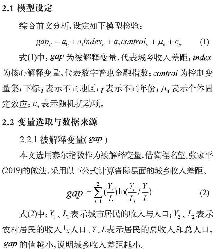 式(2)中:、表示城市居民的收入与人口;、表示农村居民的收入与人口、Y、L表示居民的总收入和总人口。的值越小,说明城乡收入差距越小。