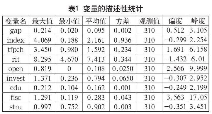借鉴李华和祝秋思(2022)的研究,选取对外开放程度()、产业结构升级(stru)、固定资产投资(invest)、财政支出结构()、教育水平(edu)为控制变量,并以各省份进出口总额、第二三产业增加值、固定投资额、政府财政支出与GDP的比值、各省份教育支出与政府财政支出的比值来表示。数据来源于《中国统计年鉴》和各地区统计年鉴,表1列出了各变量的描述性统计数据。