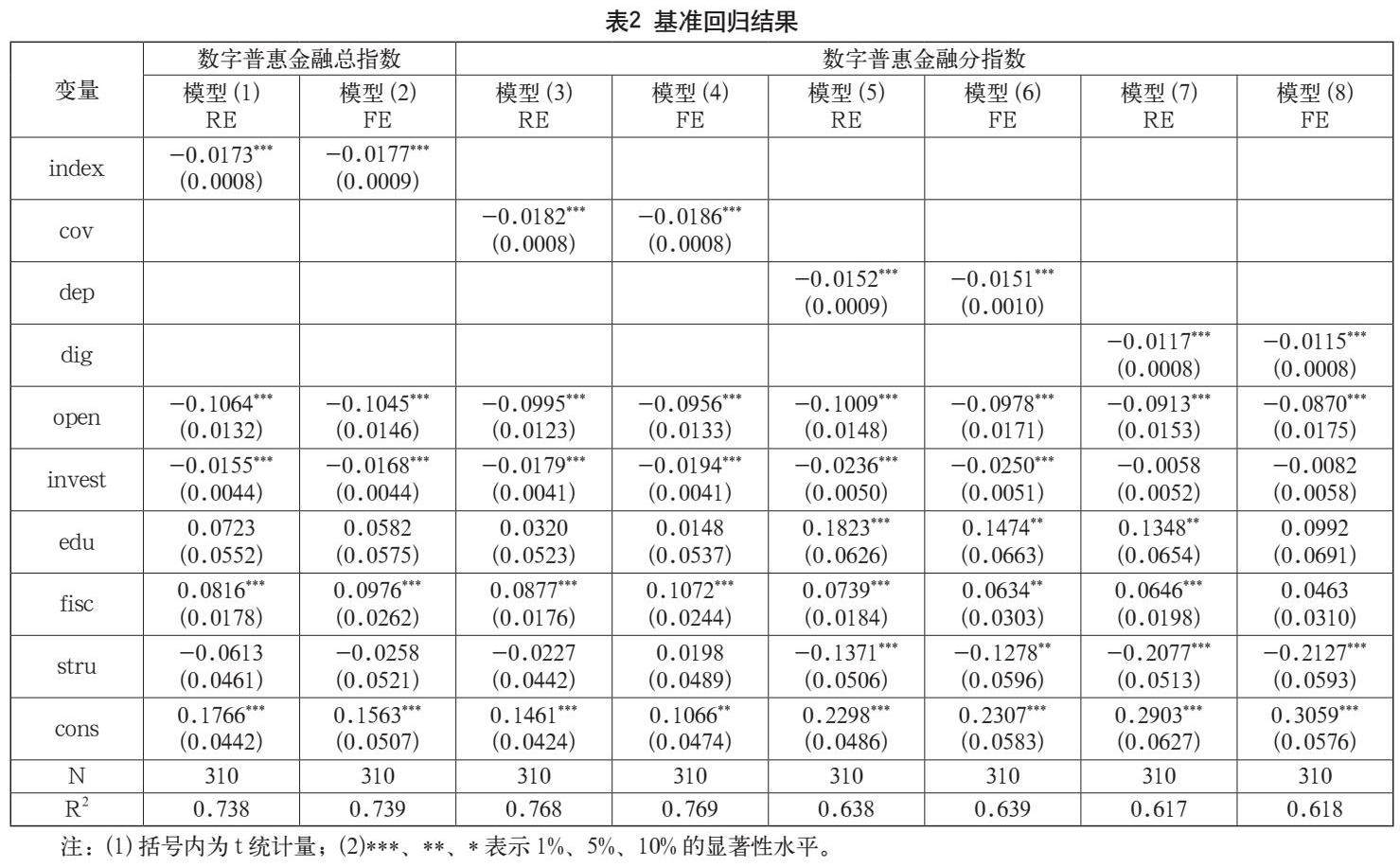 表2是本文的基准回归结果。其中,第(1)~(2)列报告了数字普惠金融总指数的回归结果。结果显示,分别使用随机效应(RE)和固定效应(FE),估计系数几乎一致,通过了显著性检验,均支持了数字普惠金融对城乡收入差距的负向阻抑作用。在控制变量中,固定资产投资、财政支出结构和对外开放程度的估计系数在1%的水平上显著,教育水平和产业发展水平的估计系数不显著。这表明,随着我国对外开放的不断深入,对外贸易持续增长,同时为农村富余劳动力提供了更多就业岗位,带动农产品的生产和销售并助力农民增收,从而缩小了城乡收入差距。财政支出结构可以直接影响收入二次分配,在保障社会福利水平的同时,也促进了社会公平发展,从而发挥的城乡收入差距收敛作用越明显。