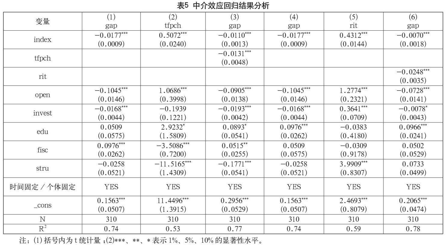 表5第(1)~(3)列报告了以农业全要素生产率为中介变量的回归结果,其中第(1)列回归结果验证了数字普惠金融具有缩小城乡收入差距的作用;第(2)列回归结果显示,数字普惠金融与农业全要素生产率在1%的水平上显著正相关,表明两者之间存在明显的促进作用;第(3)列显示了中介效应回归结果,发现中介变量系数显著为负,且核心解释变量的回归系数绝对值由0.0177下降到0.011,表明农业全要素生产率是影响城乡收入差距的重要因素,且中介机制成立,为部分中介效应,中介效应占比为38%。