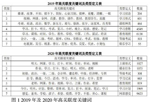 根据对比疫情前后的文本类型可以发现,在疫情爆发大学生普遍参与线上学习后,关于“网课感受”的评论数量大大增加,同时因为疫情前大部分人是主动自愿使用网课学习,而疫情后是学校要求,所以2020年类型出现了关于“上课形式”的种类。在疫情前,大部分同学是出于自己的需要,例如“课程种类”中的“考研”等而主动选择了线上学习,结合情绪分析结果可以发现主动选择线上学习的这部分同学对于这种学习方式还是比较认可的。在疫情后,有些同学较线下教学更喜欢线上学习的方式,认为网课可以重复观看,并且不受场地的限制,甚至对于有些人可以节省住宿的费用,上网课不用浪费路途中的时间,自由度高,可以休息得更好等优点。但是通过调查发现,线上教学仍存在许多问题。通过分析 2019 年至 2020年聚类后的 7 类文本,统计出每个类别的词频得到高频词,归纳总结其中的关键词可以将 7 类文本归类,得到相关信息如图1所示。