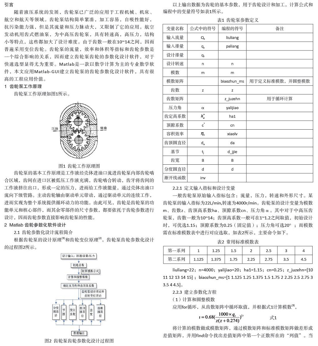 随着液压系统的发展,齿轮泵已广泛的应用于工程机械、机床、航空和航天等领域。齿轮泵结构简单紧凑,加工容易,自吸性能好,抗污染能力强,但是其流量和压力脉动大,又限制了它的应用。航空发动机用齿式燃油泵,为中高压齿轮泵,具有转速高,高压力,结构小等特点,这些都加大了设计难度。由于齿数一般在10~14之间,因而普遍采用变位齿轮。齿轮泵的流量,效率和体积等指标和齿轮参数是一个综合影响的关系,因而建立齿轮泵齿轮的参数化设计软件,对于快速选型显得尤为重要。Matlab是一款以数学计算为主的专业数学软件,本文应用Matlab-GUI建立齿轮泵的齿轮参数化设计软件,具有很高的工程应用价值。