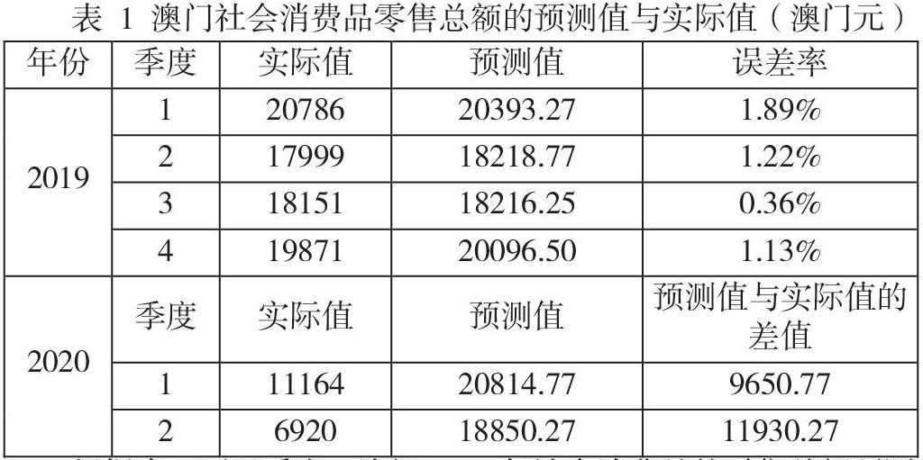 根据表1可以看出,澳门2019年社会消费品的零售总额预测值与实际值差值不大,四个季度的预测误差率不超过2%,由此可得,该预测曲线合理。