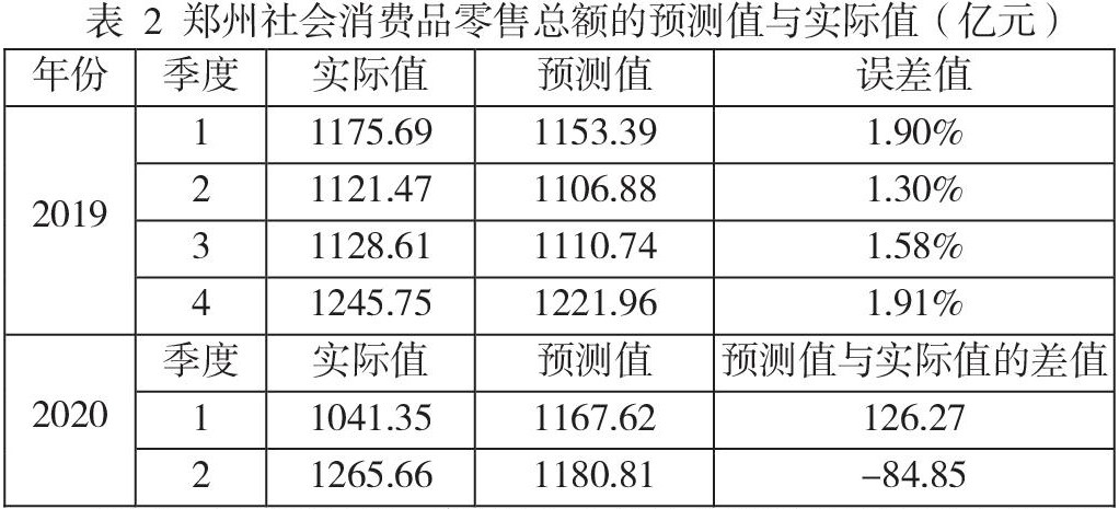 根据表2可以看出,郑州2019年社会消费品的零售总额预测值与实际值差值不大,四个季度的预测误差率不超过2%,由此可得,该预测曲线合理。