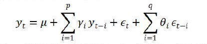 由于发电量是随时间变化且相互关联的数据序列,因此我们考虑采用时间序列模型中的差分自回归移动平均模型(ARIMA)。由于该序列具有趋势,可以通过差分法将其变为平稳序列,该模型中的自回归模型(AR)用于表示目前数值和过去数值之间的相关性。而移动平均模型(MA)关注的是模型中误差项的累积,能够有效的消除预测中的随机波动[1]。将三者方法综合起来,得到ARIMA(p、d、q)模型,d为差分阶数,该模型的基本公式为: