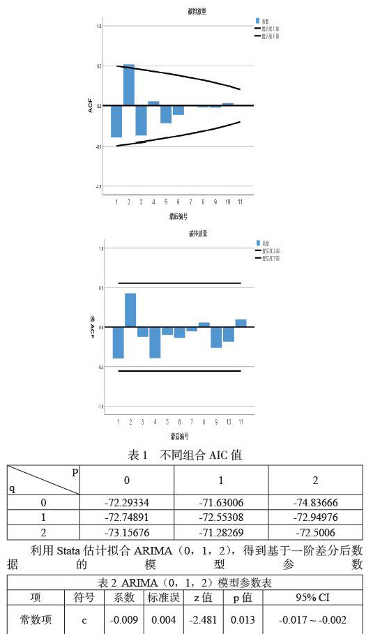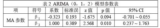 利用Stata估计拟合ARIMA(0,1,2),得到基于一阶差分后数据的模型参数表2 ARIMA(0,1,2)模型参数表