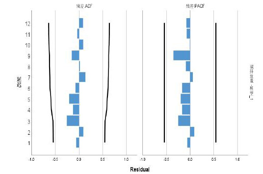 另外该模型还需要对残差进行白噪声检验,即残差不存在相关性。通过Q统计量进行白噪声检验,得到Q值为2.1613,对应p值为0.7061大于0.05,说明接受原假设即残差为白噪声,该模型满足要求可正常使用,该模型拟合优度R2为0.958。另外,通过残差的ACF图和PACF图也可以看出都落在置信范围内。