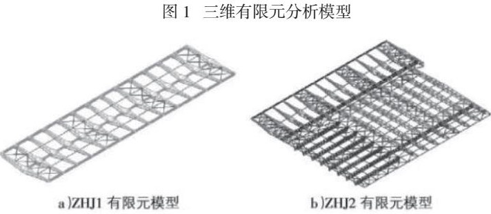使用有限元软件MIDAS进行分析,建立屋盖结构模型。该体育馆钢网架分为钢网架和混凝土两个部分其分别为:ZHHJ1和ZHJ2。三维空间整体计算模型见图1。