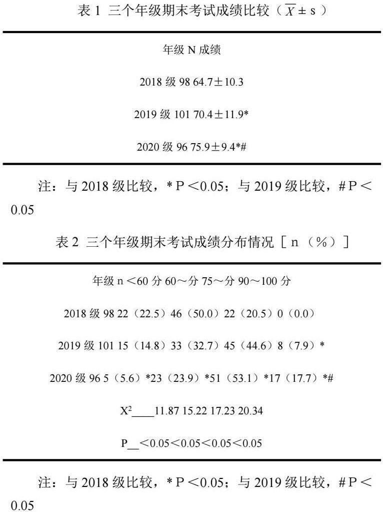 (2)期末考试成绩考试题目由教学团队在教学题库里随机抽取,试题难度和题量与历年考题相当,进行线下闭卷考试,教学团队老师根据统一阅卷标准进行流水式阅卷,并对同一主讲教师授课的本科临床医学专业2018级5-6班98名学生,2019级5-6班101名学生,2020级5-6班96名学生的期末成绩进行对比分析。