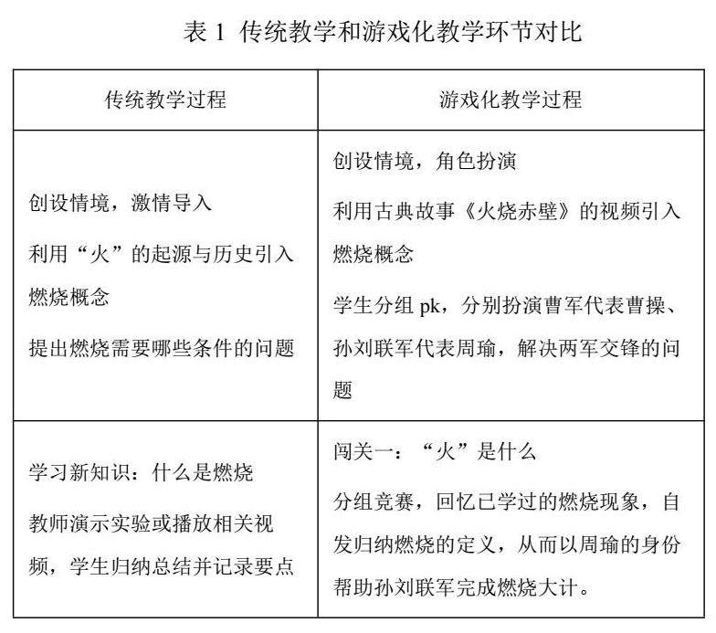 以表1中为例,将课堂的导入环节设计为相关性的角色扮演游戏导入,新授环节的第一环节则将相关的课程知识“燃烧的定义”设计为游戏中的一次闯关。通过角色扮演让学生身临其境的体会化学知识源于生活,并能在掌握后服务于生活。既能恰到好处的引导学生主动进入课堂学习状态,又能收获良好的课堂教学效果。