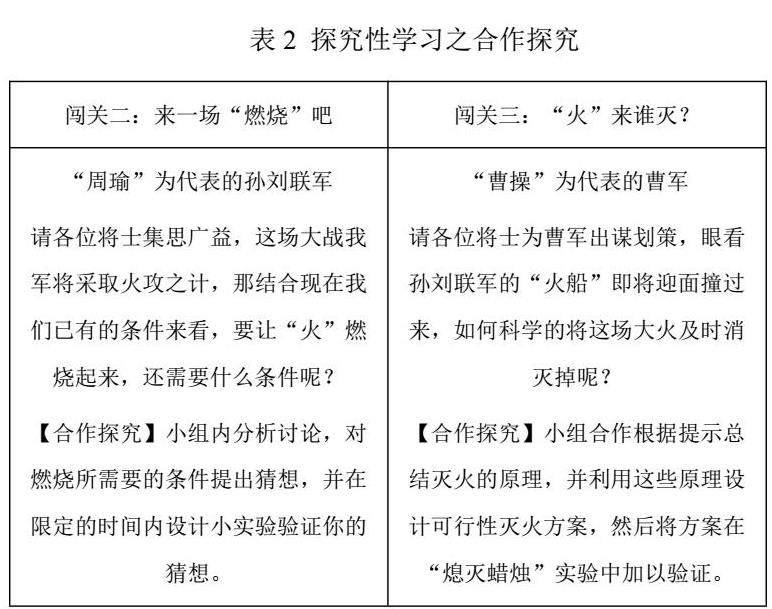 结合表1中的环节设计可看出这次游戏化探究性学习相当于一次“赤壁之战闯关赛”。在“闯关”的第一关,“挑战者”首先化身相应历史人物锁定需要解决的问题“什么是燃烧?”,在相关生活经验中及已有知识下,“单枪匹马”的进入自主学习阶段。