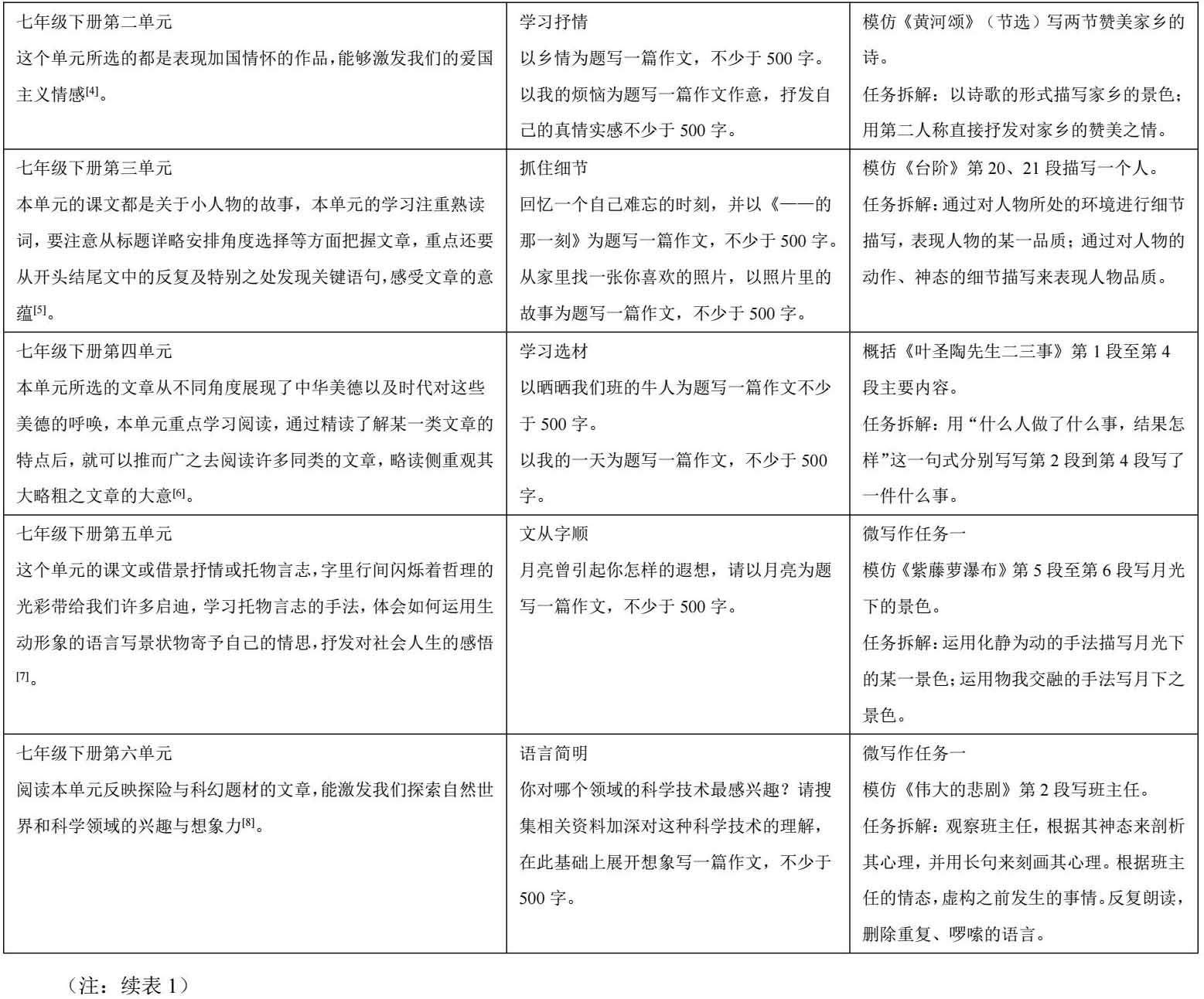 为了使作文训练频率更高效果更好,教学前首先需要将单元写作任务拆解为多个微写作任务,通过多频率小篇幅的散点式训练完成单元写作任务。改变传统的作文教学中将写作教学后置于整个阅读教学的教学模式,将写作训练融于阅读教学中,将日常的阅读教学和写作教学贯通起来,让阅读因日常微写作的存在而得到准确检验和深度巩固,让阅读的“输入”和“写作”的输出形成平衡共生之势。实现这种读写共生的美好局面,单元写作任务的拆解是关键抓手,现以七年级下册册为例设计并拆解基于读写结合的微写作任务。(见表1)