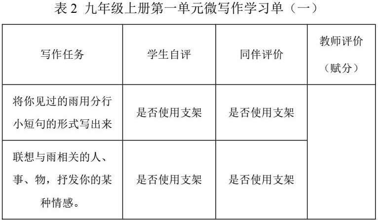 在传统的作文写作训练中写作评价是以教师评价为主体,存在价主体单一、评价任务耗时耗力、评价反馈不及时等问题。初中语文读写共生微写作教学倡导教学评一体化、评价主体多元化、评价效率化的特点。为实现上述目标,在微写作评价过程中设置有学教评一体化学习单(见表2)。学习单上的写作目标可以转变为学生自学目标,实现写作输出支架和写作输入支架的灵活转换,且写作目标即教师备课指导和教学目标;在评价方面该学习目标又可以转变为评价标准,实现学生自评、同伴互评、教师总评时参照同一评价标准。学生自我评价和同伴评价时,会进行自我审视从而加深对写作支架的印象和理解,学生自评和同伴互评的结果还可以成为教师评价和作文讲评的重要参考,教师的作文批改从原来的混沌不清、主观随性转变为量化式快捷批改,教师大致浏览学生自评和同伴互评结果即可客观赋分,还可以根据学生自评和他评结果获取全班同学的掌握情况,从而为选择作文讲评的方式提供有力的决策依据。