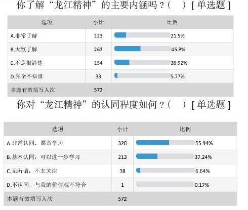 通过调查问卷分析结果,我院黑龙江省内的生源达到百分之七十多,对于龙江精神的创新与传承有一定的人文基础。但多数同学对龙江精神内涵的了解却并不深入,甚至一知半解。而在调查中可以看出学生们对龙江精神的认可度却非常高,大约近百分之九十的学生愿意进一步学习和了解。