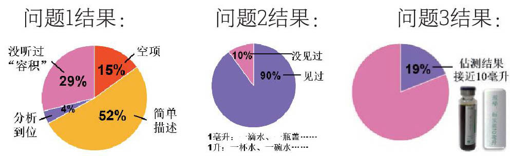 《容积和容积单位》既是对体积知识应用的深化,又是液体体积计量方法和单位的拓展,是培养学生度量思维的载体。为了找准学生认知发展区的最近区域,我们设计三个问题对班级学生进行课前调查: