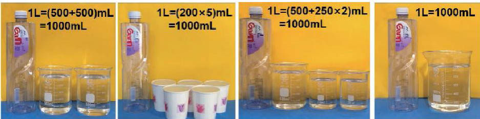 为了进一步丰富量感,深化理解,我们让学生联系生活体会40L大约有多少,如40L相当于40瓶牛奶、8瓶葵花籽油等,真切地建立起对40升的感觉,发展量感。