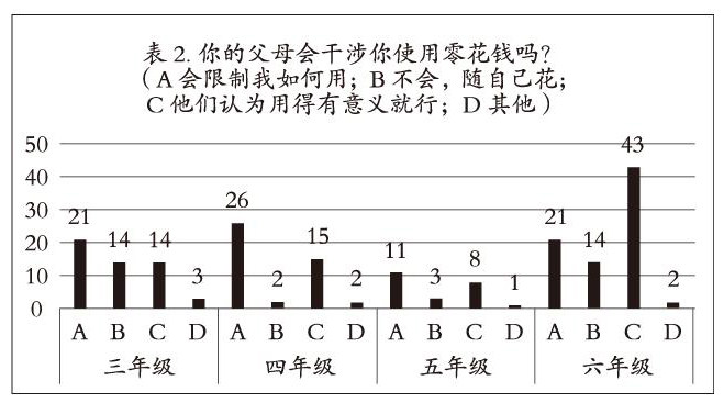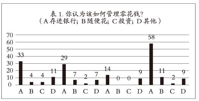 基于上述现状,我们面向全校开展了一次调查问卷。此次问卷调查面向育才四小全体学生,参与卷问调查的学生共200人,其中男生106人,女生94人。由表1可知,在如何管理零花钱方面,各个年级超过60%的人均认为要存进银行,其中六年级有58人,达到本年级的72.5%。综合来看,学生比较缺乏理财知识,随着年龄的增长,学生的理财依旧仅仅停留在存进银行。各年级选择随便使用以及投资的人数较少,说明学生缺少对其他理财途径及理财方法的了解。