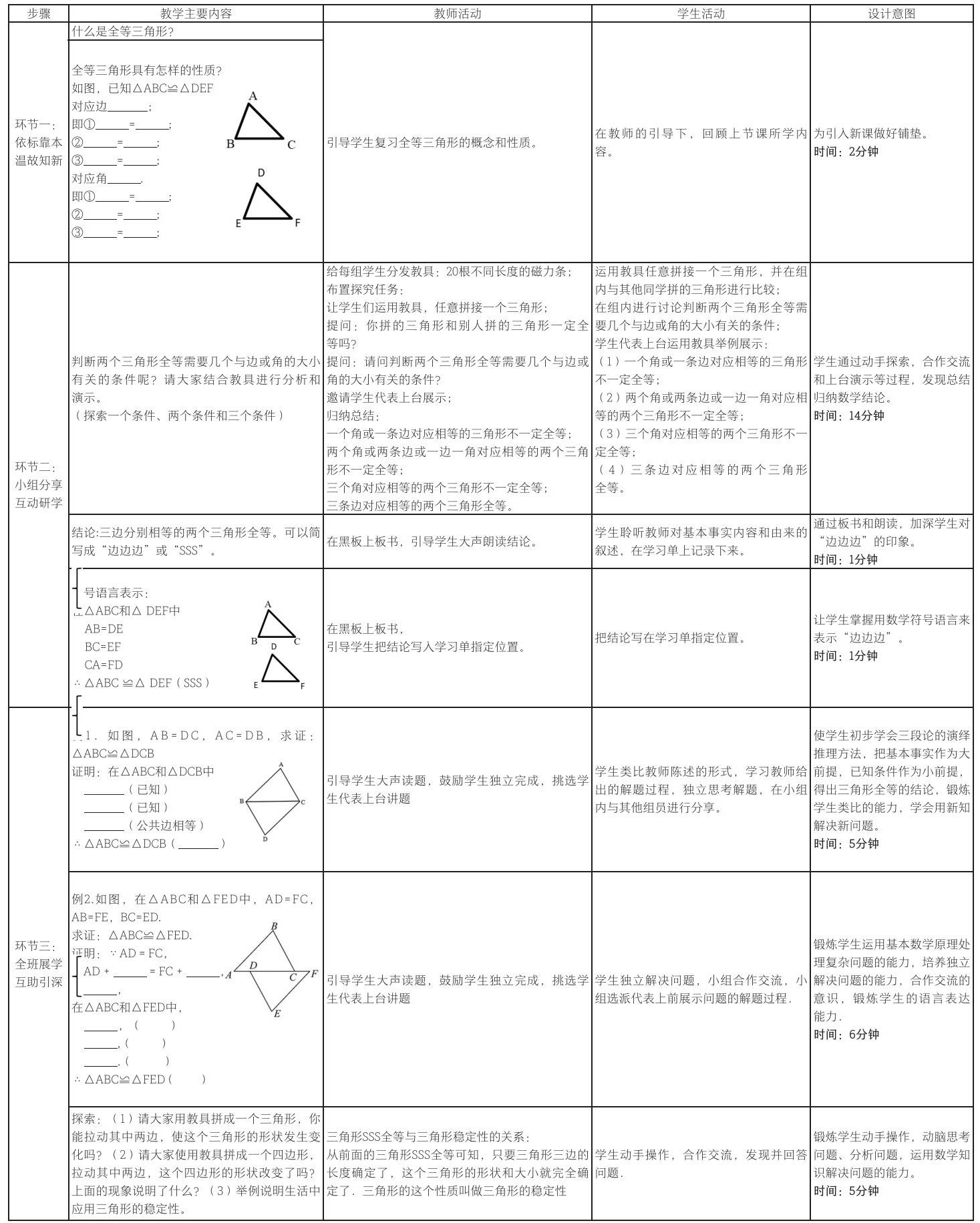 环节二是小组分享,互动研学,通过问题“判断两个三角形全等需要几个与边或角的大小有关的条件呢?”,让学生在小组内运用教具进行分析和演示,并邀请学生代表上台分享展示,教师引导学生结合探究结果进行分类和归纳,最后总结得出三角形全等的条件SSS。