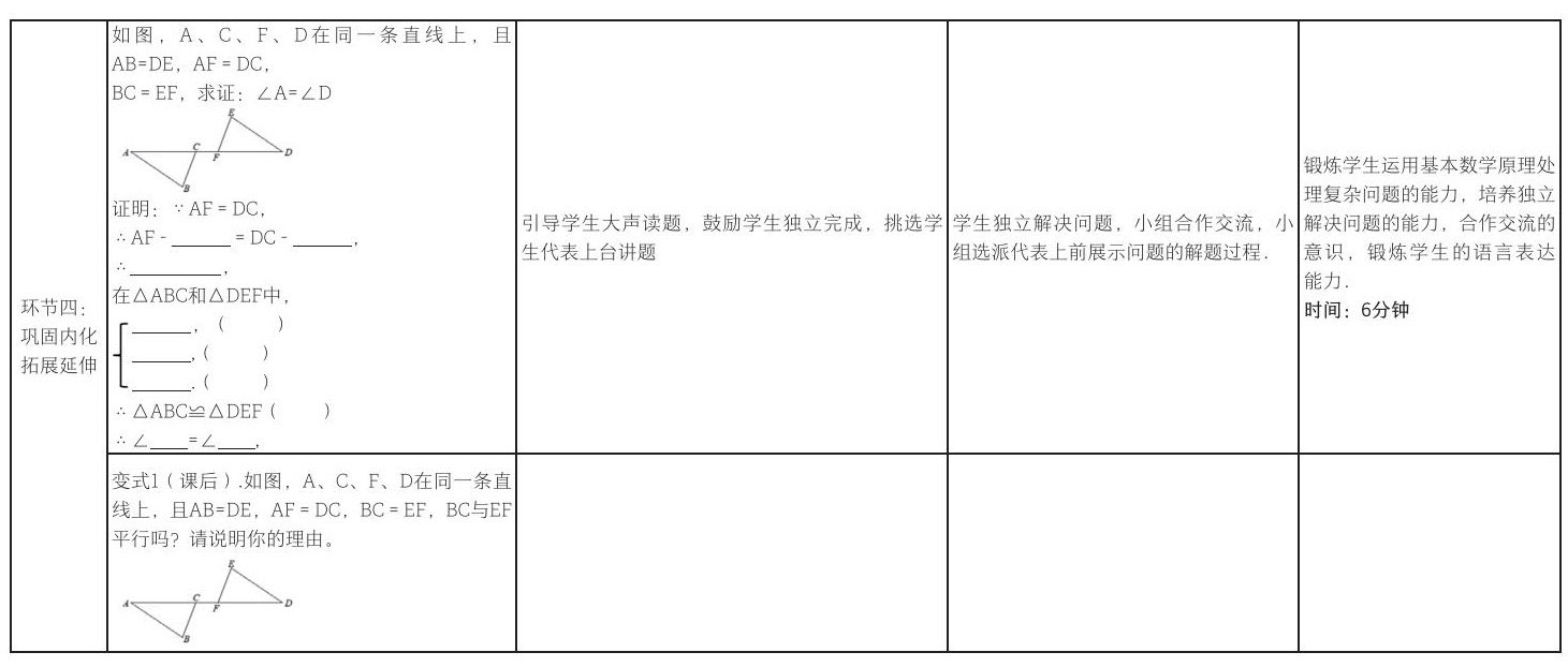 环节三是全班展学,互助引深,通过例题1和例题2对三角形全等的判定条件SSS进行运用和巩固。学生运用教具拼三角形和四边形,直观感受三角形的稳定性和四边形不具备稳定性,并让学生举例说明生活中应用三角形稳定性的事例。