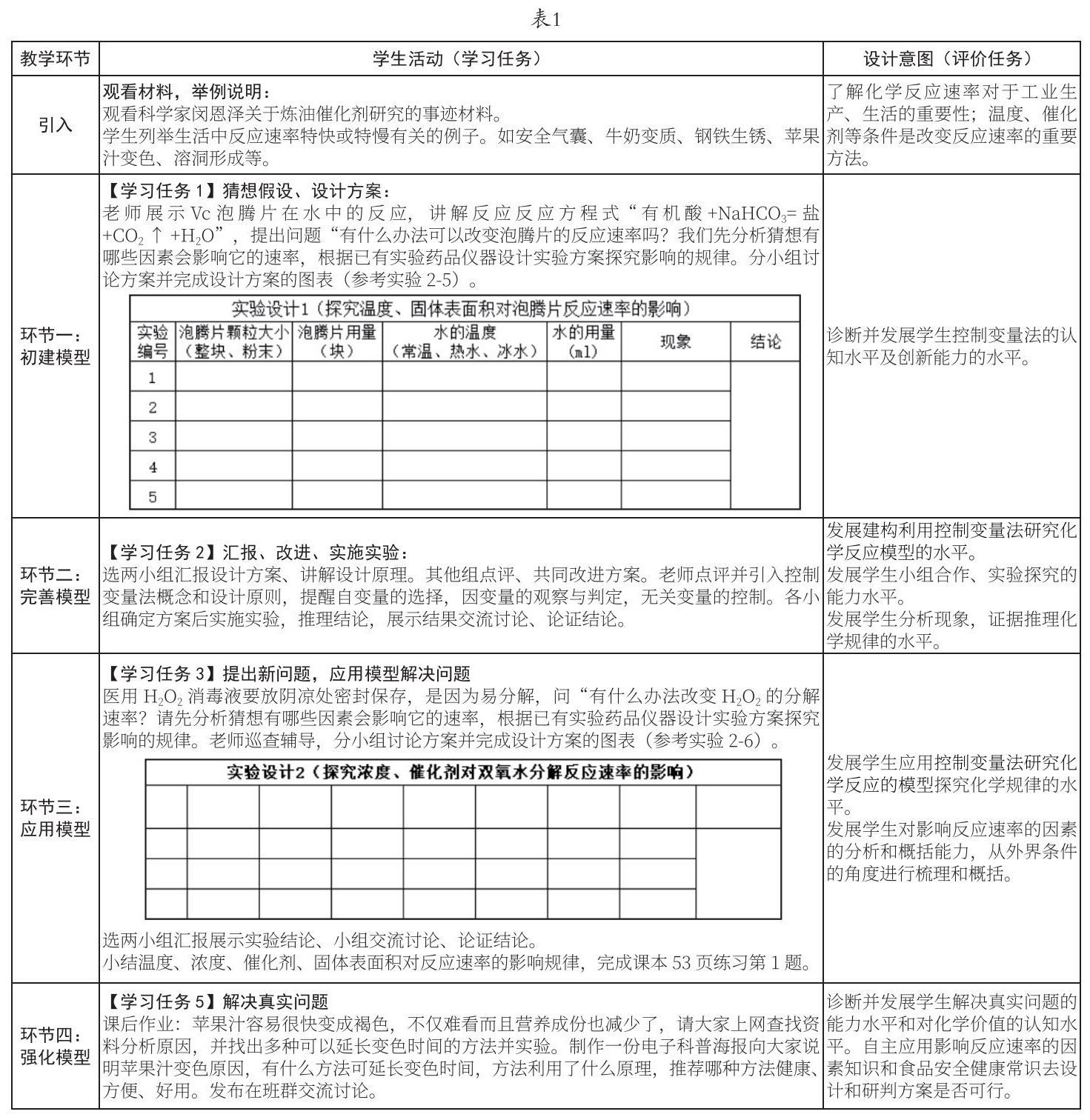 课堂上的两个探究实验要求小组讨论设计实验方案,汇报互评,改进实施。此过程注重的是学生的思维开发、探究能力的培养。而“提出问题—分析因素—设计方案(研判自变量的选择、无关变量的控制、因变量的观察与判定)—实施实验推理结论—批判证据反思结论”的模型的建构既符合科学研究的真实过程,又注重发展化学学科的核心素养。