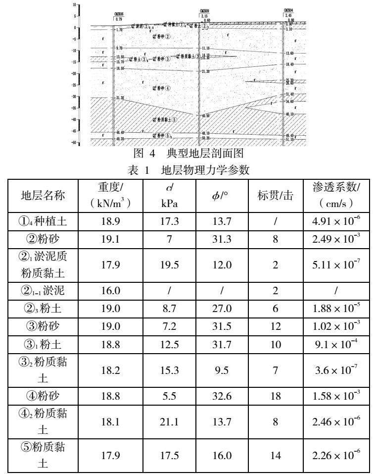 地质勘察报告显示,拟建场地浅层埋深1m范围主要为①4种植土。在1~31m深度范围主要分布有松散②粉砂、稍密③粉砂和中密④粉砂,均为饱和状态,标贯击数8~18击。在31m~46m深度范围主要分布有软塑状⑤粉质黏土,标贯击数8~18击。典型地层剖面如图4所示;地层物理力学参数如表1所示。