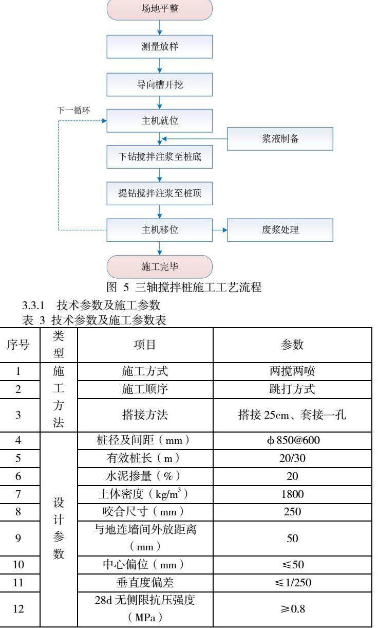 (2)搭接方式采用套打一孔施工方法,相邻三轴搅拌桩形成有效搭接。