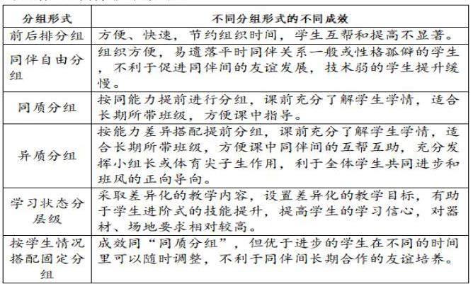 笔者经过问卷,收回158份有效问卷,得出95%以上的老师在课堂中采用“小组化”学练组织形式。因此,了解和掌握不同形式的分组成效是我们的必修课。经实践,笔者小结为下图(1-3)。在教学实践中,体育老师可以按照教学任务、教学内容、项目特点、场地器材情况、班级组成实况、学生的学习状态等情况选择合理的分组形式,以确保教学效果。