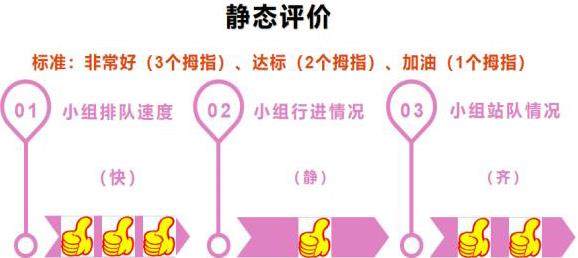 在小组长的带领下,每组进入上课指定场地,各队副组长交叉评价。此评价表简单易行,内容针对性强,又可以与其他各类评价相结合,如:课前准备、个人着装、请假制度等,是一个通用的“静态评价单 ”,学生易操作,教师易统计。